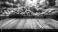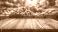• Empty wooden table with blurred background of fresh produce at a market