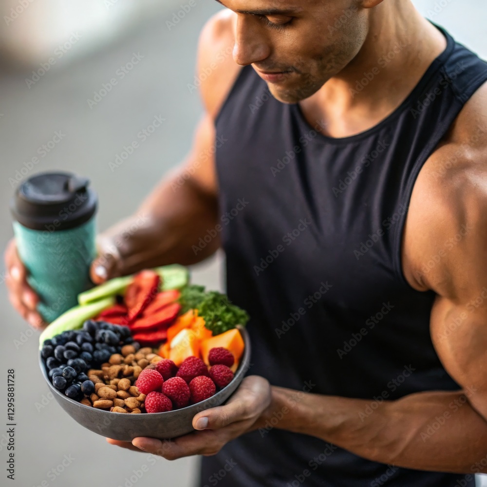 • Healthy food and fitness lifestyle. Close-up of a muscular athlete holding energy-packed superfoods, sports nutrition essentials, performance-boosting diet. Sports Nutrition