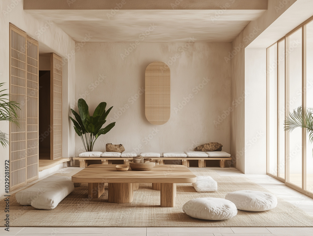 Architektura - Japandi Boho styl oświetlony salon architektura wnętrz 01 #1029281972