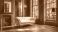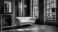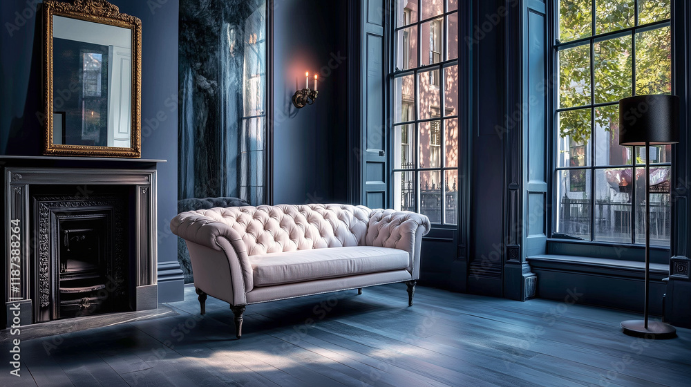 • Biała luksusowa sofa w ciemnym salonie z kominkiem