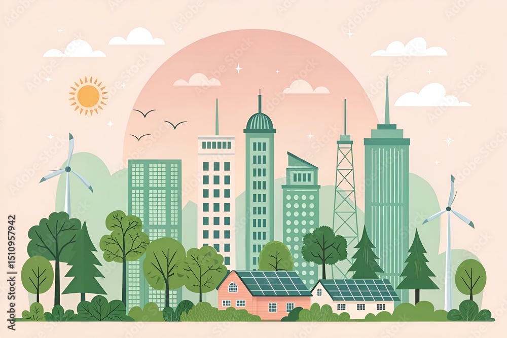 Architektura - Zrównoważone miasto z zielenią, panelami słonecznymi i turbinami wiatrowymi – koncepcja ekologii... #1510957942