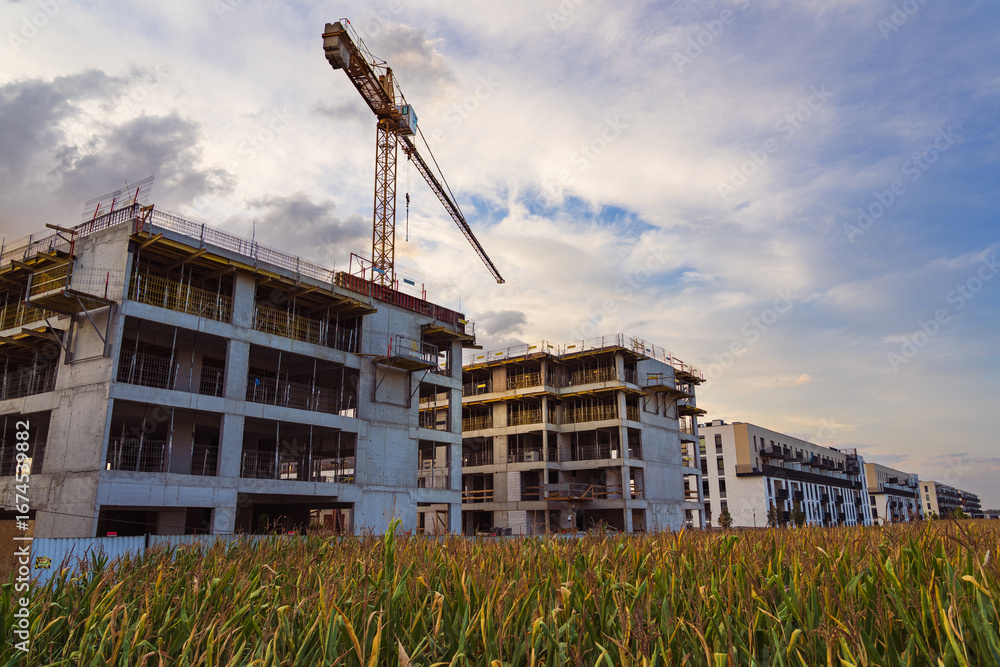 Architektura - budowa nowego osiedla mieszkaniowego w Warszawie pomiędzy polami kukurydzy #1674539882