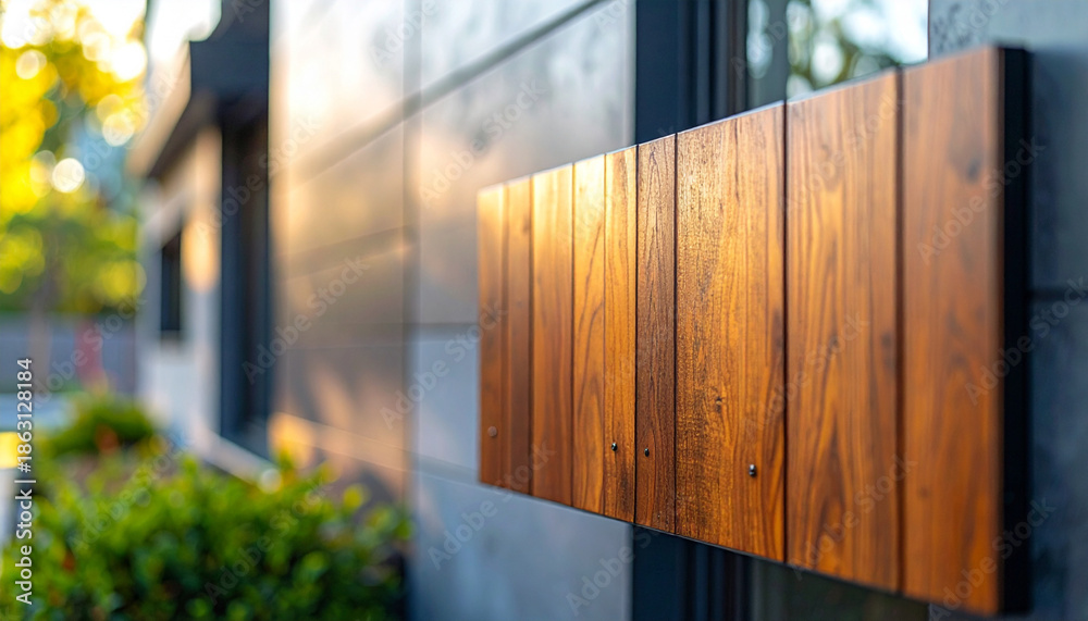 • Nowoczesna elewacja z drewna i szarych płyt - tło