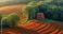 • Widok z lotu ptaka na czerwony mały dom otoczony drzewami i zadbanym pomarańczowym polem