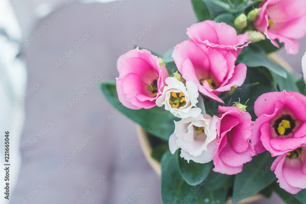 Wiosenne kwiaty i liście na marmurowym tle, uchwycone w wyjątkowej fotografii o eleganckim stylu.