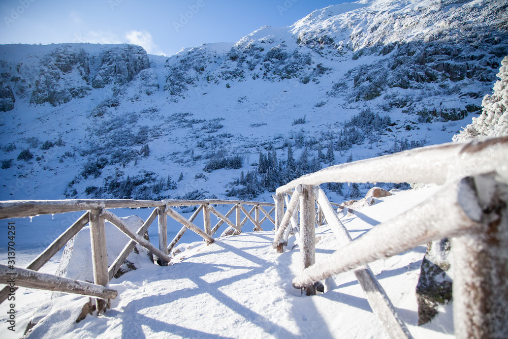 Mosty - zimowy most drewniany w górach pokryty lodem i śniegiem #313704251