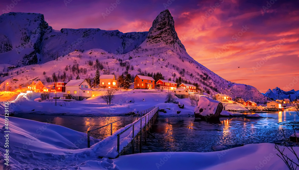 • Amazing evening on Lofoten. Scenic photo of winter fishing village and colorful sky. stunning natural background. Picturesque Scenery of Reinefjord one most popular place of Lofoten islands. Norway