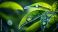 • Vibrant greenery serves as a backdrop for glistening water droplets, suspended in mid-air.