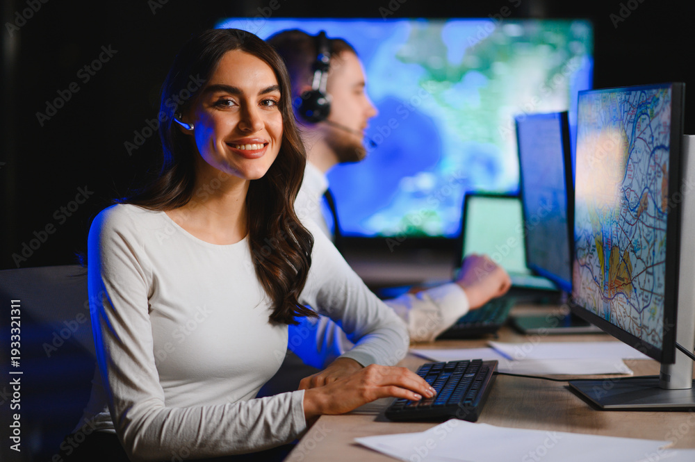 Pejzaże - Woman working in logistics dispatch center smiling #1933321311