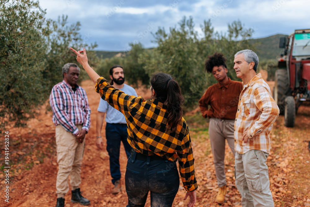 Pejzaże - Multicultural team discussing olive harvest plans in a rural olive grove during an autumn field... #1941952824