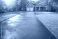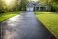 • Newly paved asphalt driveway leading to modern suburban house with green lawn in sunny residential neighborhood