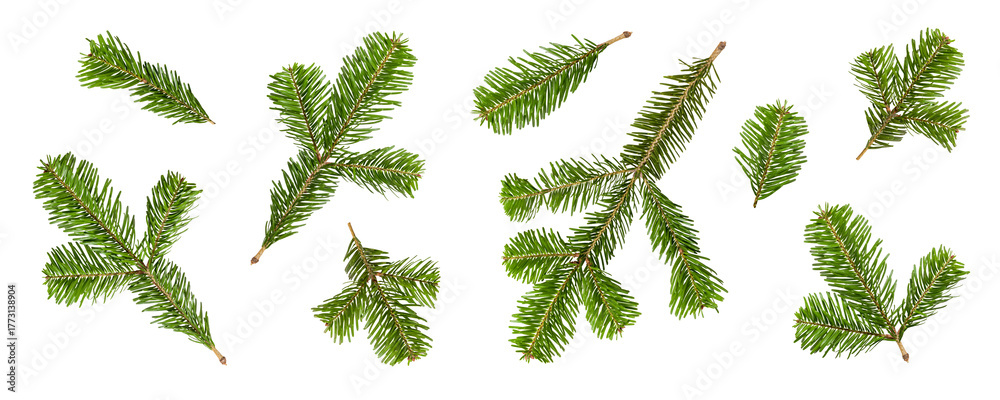 • Set of green fir tree, pine or spruce branches isolated on a transparent background, PNG. High resolution. Natural evergreen elements for Christmas and winter decoration design.