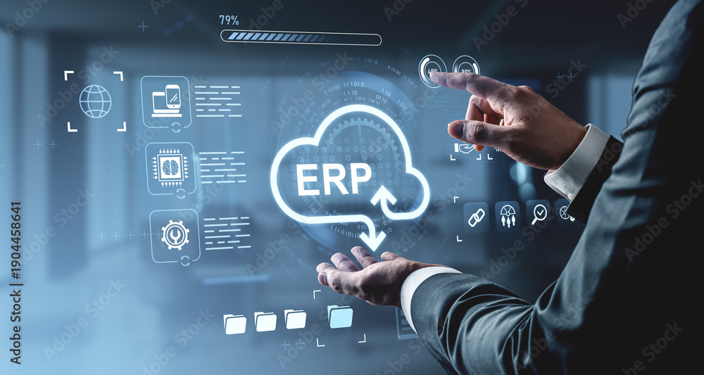 • Businessman using virtual ERP interface with cloud computing icons on digital futuristic background for enterprise resource planning concept.
