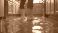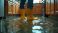 • Person wears yellow boots wading through flooded kitchen. Water covers floor near cabinets and appliances. Reflections show submerged room surfaces.