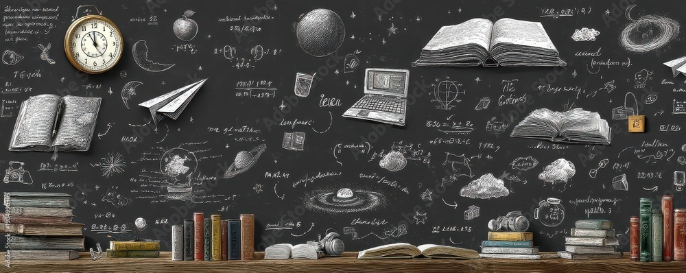 Pojazdy - Illustrative chalkboard with books and sketches explores science education themes #1984990305
