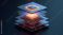 • Layered microchip processor circuit board components glow with internal light. Futuristic tech schematic visualizes data processing architecture and intricate electronic hardware design.