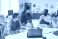 • Diverse group of adults including Asian man, woman, Black man collaborating around table in modern office, in discussion with laptops and documents visible