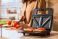 • Modern sandwich maker with snacks against woman cutting tomato on table in kitchen, closeup