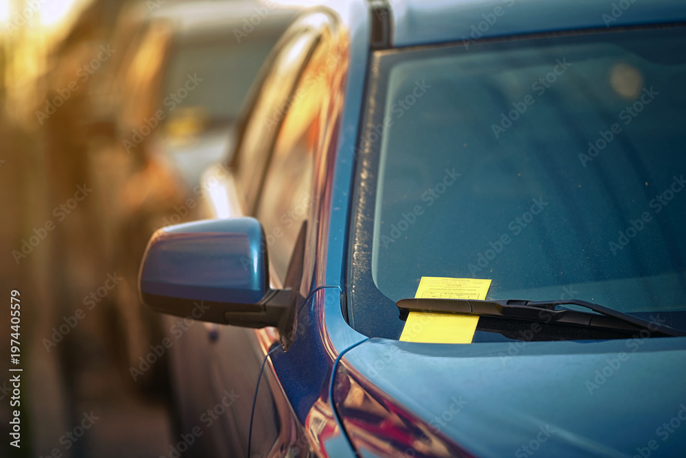 Sport - Yellow parking ticket over car windscreen wiper. Payment notice for parking penalty secured under... #1974405579
