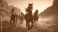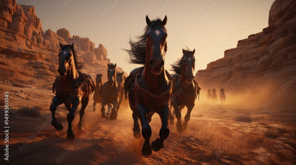 • Stado czarnych koni pędzących przez pustynną dolinę o zachodzie słońca