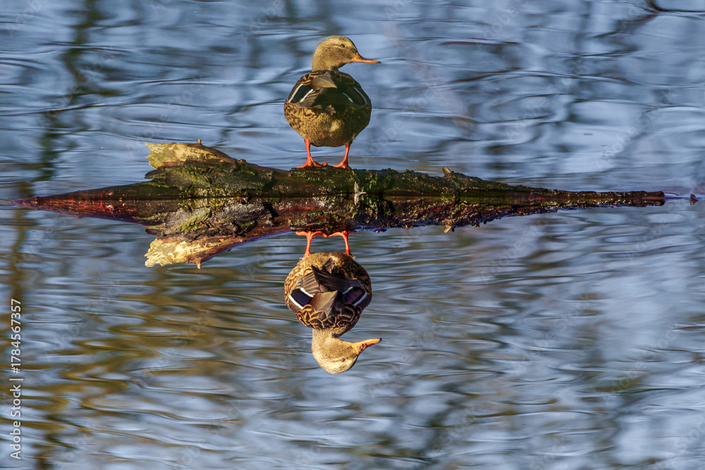 Zwierzęta - kaczka krzyżówka stoi na kłodzie drzewa pływającej po wodzie #1784567357