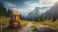 • Na zielonym polu leży żółty plecak oczekujący na dalsze podróże i przygody