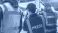 Silhouette of a figure skater performing on a dark indoor ice rink with bright blue backlight and mist. Dramatic winter sports scene with elegant pose, motion and theatrical atmosphere.