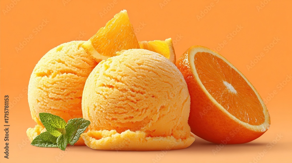 • Refreshing orange sorbet delight, crowned with fresh fruit and vibrant green mint sprigs