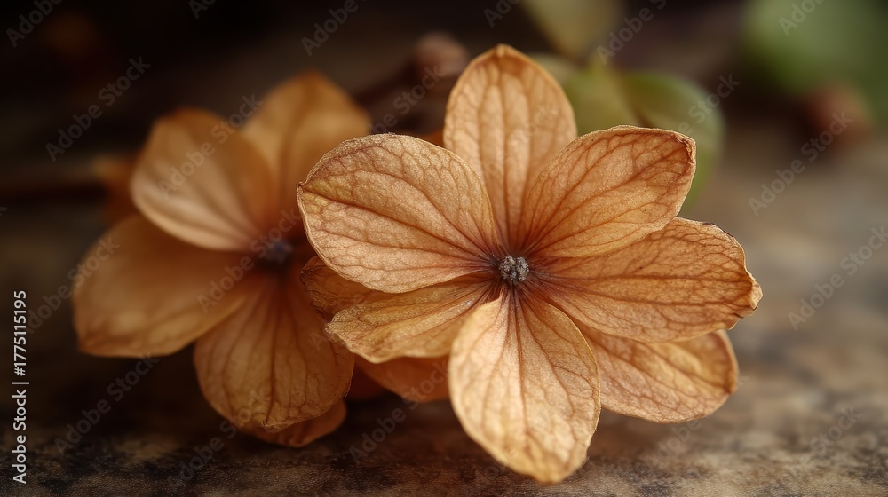 • Close up of perfectly preserved dried orange Hydrangea flower