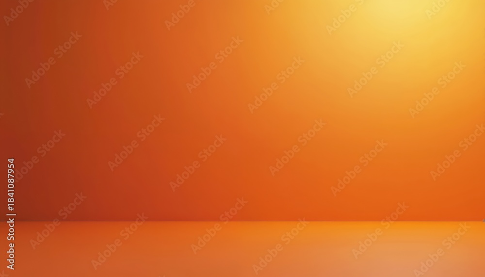 • Empty studio with smooth orange and yellow gradient background and floor. Clean backdrop for product placement or creative design projects. Minimalist scene for ad campaigns.