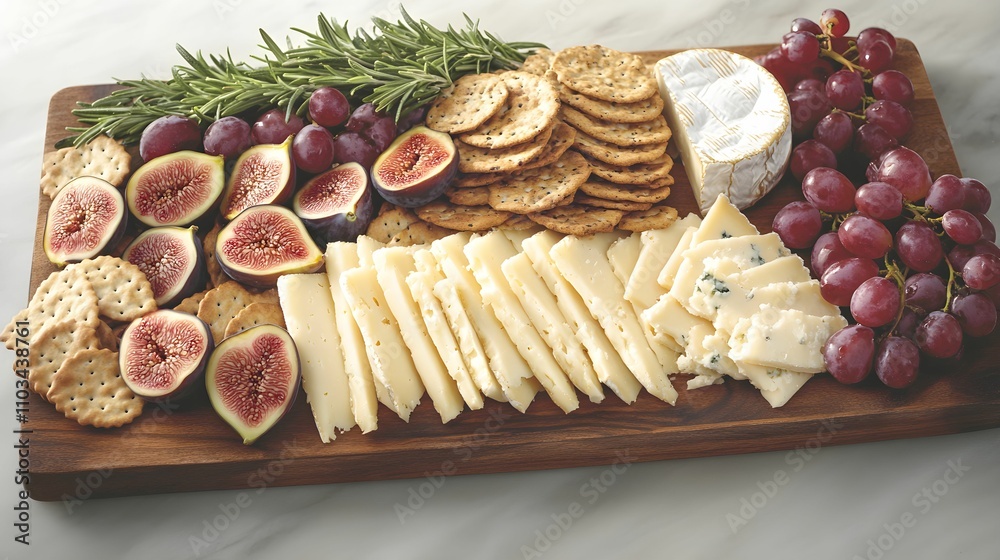 • deska serów, serów rzemieślniczych, figi, winogrona, krakersy, rozmaryn, rustykalna deska, fotografia kulinarna, naturalne światło, detal, tekstura, kolor, smakowite jedzenie, elegancka aranżacja, des