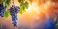 • Ripe bunches of dark grapes hanging from vine with autumnal leaves and warm sunlight background