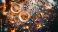• Two elegant glasses of champagne with festive Christmas decorations in the background, creating a warm holiday atmosphere.