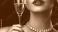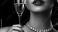 • A woman with deep red lipstick, sipping champagne from a crystal glass, diamonds sparkling at her neck.