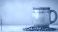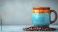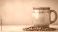 • Colorful ceramic mug with coffee beans on a textured background. Possible stock photo use