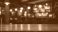 • Empty Brown Wooden Table in Bar with Blurred Warm Lighting