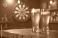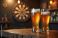 • Two glasses of golden beer sit on rustic wooden table in dimly lit, cozy pub. Colorful dartboard hangs on wall in blurred background, suggesting lively atmosphere for games, socializing. Perfect for