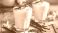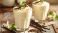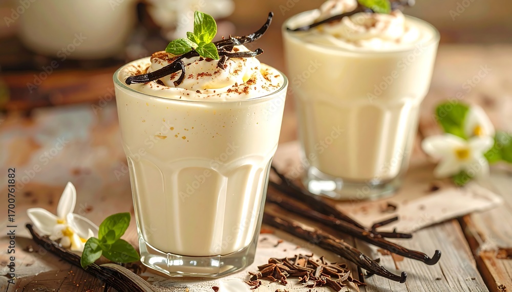 • Two glasses of creamy vanilla milkshake, topped with whipped cream, cocoa powder, and vanilla beans, sit on a rustic wooden surface, creating a delicious and inviting image.