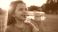 • Young girl smiling joyfully drinking fresh water from a bottle outdoors during a warm sunset