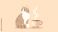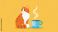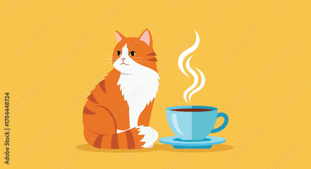 • Illustration of cute orange cat sitting beside a steaming coffee cup on yellow background