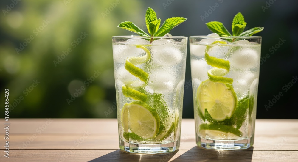 Do Restauracji - Refreshing Lime Mojito Drinks in Tall Glasses on Wooden Table #1784585420
