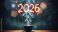 • New Year 2026 concept with coffee mug and bright fireworks display
