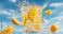 • A tall glass filled with ice and lemon wedges splashes as water is poured into it. The scene captures the feeling of summer and refreshment under a bright blue sky.