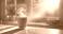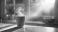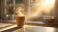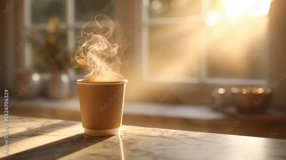 • A steaming cup of coffee rests on a marble countertop. The warm glow of early morning sunlight filters through the window, creating a cozy atmosphere in the kitchen.