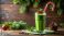 • Festive green smoothie with candy cane and christmas decor on rustic wood background for wellness and healthy holiday vibes.