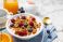 Do Restauracji - Tasty breakfast. Granola with yogurt and fruits served on white marble table, closeup #1833324608