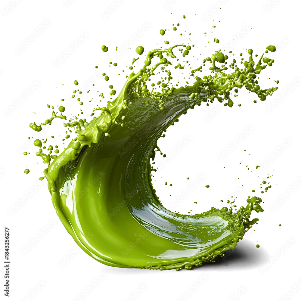 • Front view of an organic wave-shaped matcha splash isolated on a white transparent background