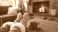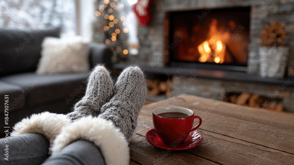 • Feet in warm, patterned socks rest on a cozy couch with a cup of coffee nearby, while a crackling fire adds to the comfort of the scene