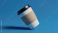 • White disposable coffee cup with brown sleeve and black lid on blue background