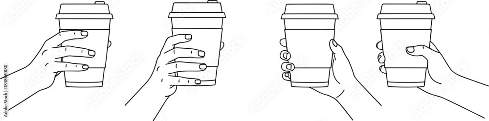 • Hands holding takeaway coffee cup outline vector set showing different hand grips and angles isolated on white background for cafe, beverage, and lifestyle design